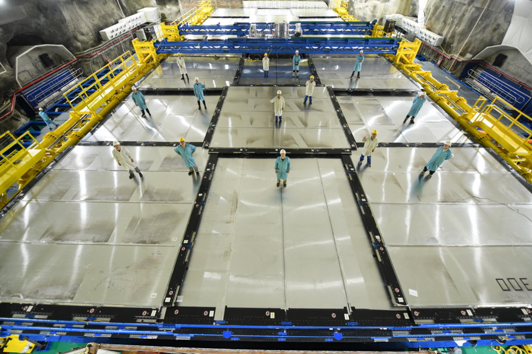 26日,江门中微子实验(JUNO)成功完成2万吨液体闪烁体灌注,并正式运行取数。这座历时十余年建设的重大科学设施,将着手解决粒子物理学领域未来十年内的重大问题之一:中微子质量排序。JUNO探测器位于广东省江门市附近的地下700米处,可以探测53公里外台山和阳江核电站产生的中微子,并以前所未有的精度测量它们的能谱。与国际同类实验相比,JUNO对质量顺序的测定不受地球物质效应和其它未知中微子振荡参数的影响,并将显著提高6个中微子振荡参数中3个参数的精度。JUNO实验使我们能够对来自太阳、超新星、大气和地球的中微子开展前沿研究,并将开启探索未知物理的新窗口,包括对不活跃中微子和质子衰变的搜寻。JUNO的核心探测器为有效质量达2万吨的液体闪烁体探测器(中心探测器),安置于地下实验大厅44米深的水池中央。直径41.1米的不锈钢网壳作为主支撑结构,承载了包括35.4米直径的有机玻璃球、两万吨液体闪烁体、两万只20英寸光电倍增管、两万五千只3英寸光电倍增管以及前端电子学、电缆、防磁线圈和隔光板等众多关键部件。遍布探测器内壁的光电倍增管协同工作,探测中微子与液闪相互作用产生的闪烁光,并将其转换为电信号输出。