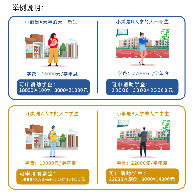 一种情况,你是第一学年新生(应届生),项目规定第一学年新生学费资助标准,在限额内按100%的比例全额给予资助(年度学费资助标准限额2万元/人/学年),另外还可以申请生活费资助(标准为3000元/人/学年度),因此你可申请到18000×100%+3000=21000元的资助金;如果你的学费是22000元,你可申请到20000+3000=23000元资助金(学费超出年度资助限额,按最高资助标准20000元计算)。 另一种情况,你是第二学年及以后学年度学生(往届生),项目规定第二学年及以后学年度学生学费资助标准,在限额内每学年度按50%的比例给予资助,生活费按3000元/人/学年度的标准定额资助,因此你可申请到18000×50%+3000=12000元资助金,如果你的学费是22000元,可以申请到22000×50%+3000=14000元。