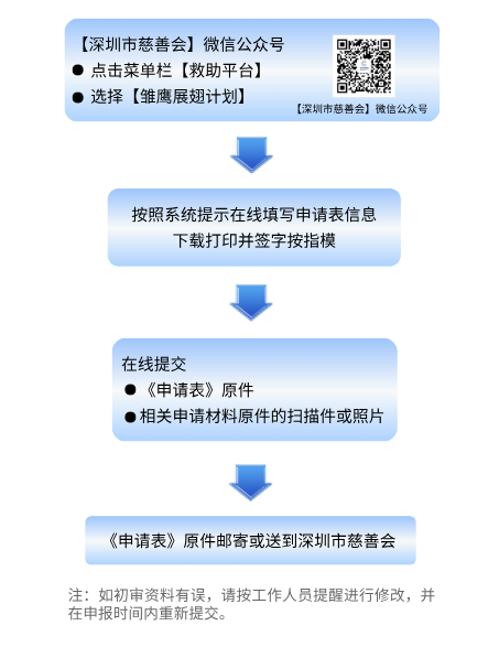 五 项目申请方式 符合奖助条件的申请人可自行选择线上或线下申请。 (一)线上申请。申请人通过深圳市慈善会微信公众号(名称为“深圳市慈善会”),点击“救助平台”选择“雏鹰展翅计划”选项,按照系统提示在线填写申请表信息,填写完成后,下载打印申请表,在“申请人承诺”栏签字并按指摸后,在线提交申请表原件和相关申请材料原件的扫描件或照片,完成线上申请。(提示:线上提交申请后,需将签署并按指模的《申请表》原件邮寄或送至深圳市慈善会(地址:深圳市罗湖区笋岗路中民时代广场B座三楼深圳市慈善会)) (二)线下申请。申请人准备好申请材料后,到项目执行方现场提交申请材料(验原件)。